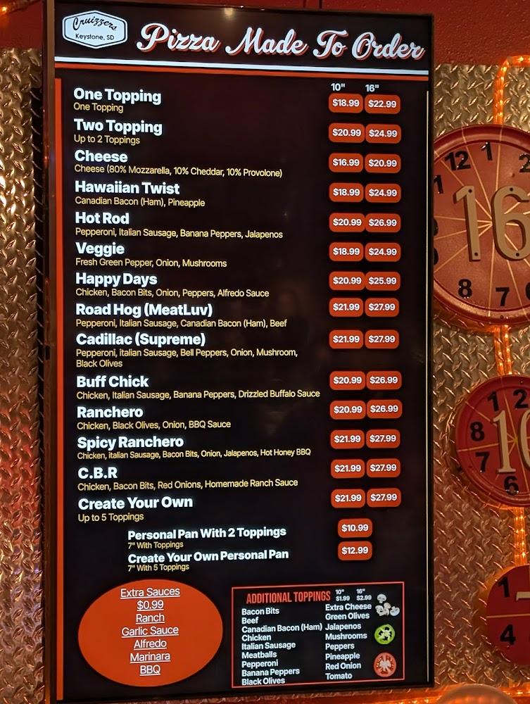 Welcome to Cruizzers, your go-to pizzeria nestled in the heart of Keystone, SD. Managed by a proud veteran and a dedicated woman, we offer a warm, inclusive atmosphere for everyone, including families and the LGBTQ+ community. Enjoy our delicious, traditional pizza and simple dishes alongside a variety of local brews and fine wines. With accessible seating, a charming patio, and options for takeout or delivery, we cater to every occasion. Whether you're indulging in our famous ranch sauce or savoring gluten-free options, Cruizzers promises a memorable dining experience. Join us for lunch or dinner and relish our inviting ambiance!