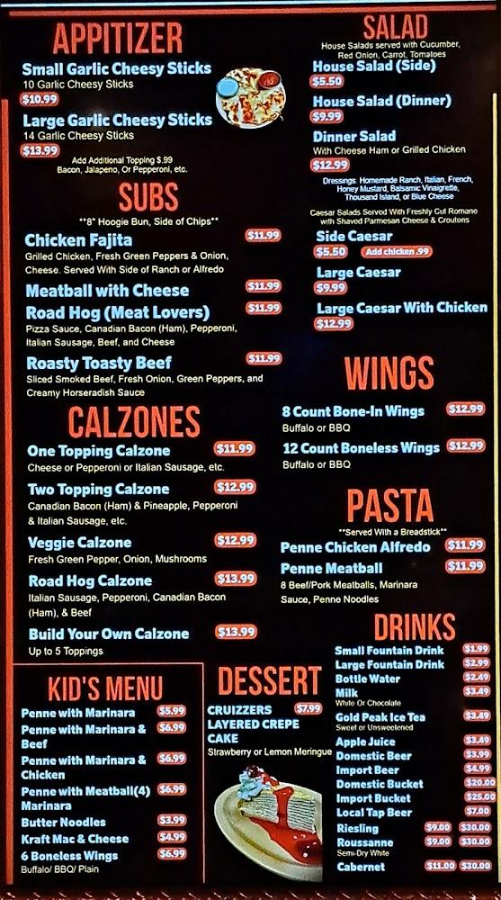 Cruizzers specializes in classic, made-to-order pizzas featuring various toppings. Personal pan pizzas, available in multiple sizes, offer plenty of topping options for customization. Signature items like the Cadillac pizza and the Hawaiian calzone reflect a commitment to quality ingredients.